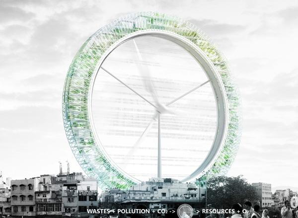 循環(huán)中心是一個大型的風(fēng)力渦輪,像一個大肺一樣,轉(zhuǎn)動在新德里城市中心,能量及二氧化碳通過摩天輪里的植物、化學(xué)過濾器、微小顆粒的膜結(jié)構(gòu)、高空溫室和礦化設(shè)備將氧氣釋放到城市上空。