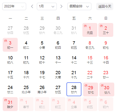 1月29日(星期六,農歷臘月二十七)至2月6日(星期日,農歷正月初六)為春節(jié)假期,共9天。2月7日(星期一,農歷正月初七)正式上班。