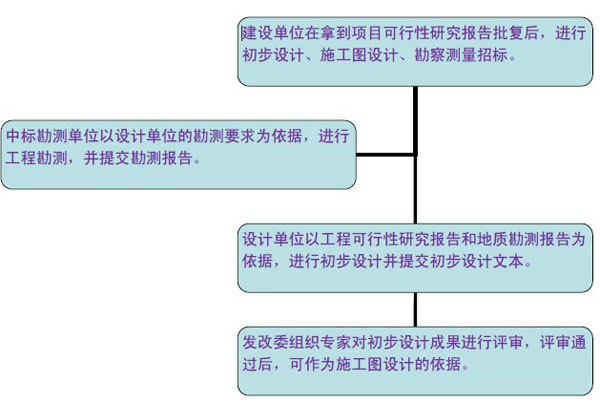 工程設計主要包括初步設計和施工圖設計。對于技術上復雜,又缺乏經驗的項目,可以在初步設計和施工圖設計兩個階段間增加技術設計。對于小型并技術簡單的道路工程,經有關部門同意后,可以利用方案設計代替初步設計,按方案設計審批后直接轉入施工圖設計。典型的流程圖如下: