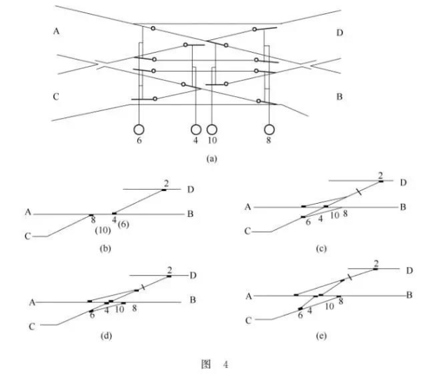 復式交分道岔之結構,如圖4(a)所示,4根尖軌用一臺轉轍機拉動,2根活動心軌 用一臺轉轍機拉動,一組交分道岔共用4臺轉轍機,暫用4、6、8、10編號。一組交分道 岔無論從其實際效用上還是電路設計上,都與圖4(b)中兩組單開道岔相當,只是為了 節省占地面積和縮短咽喉才采用復式交分道岔。