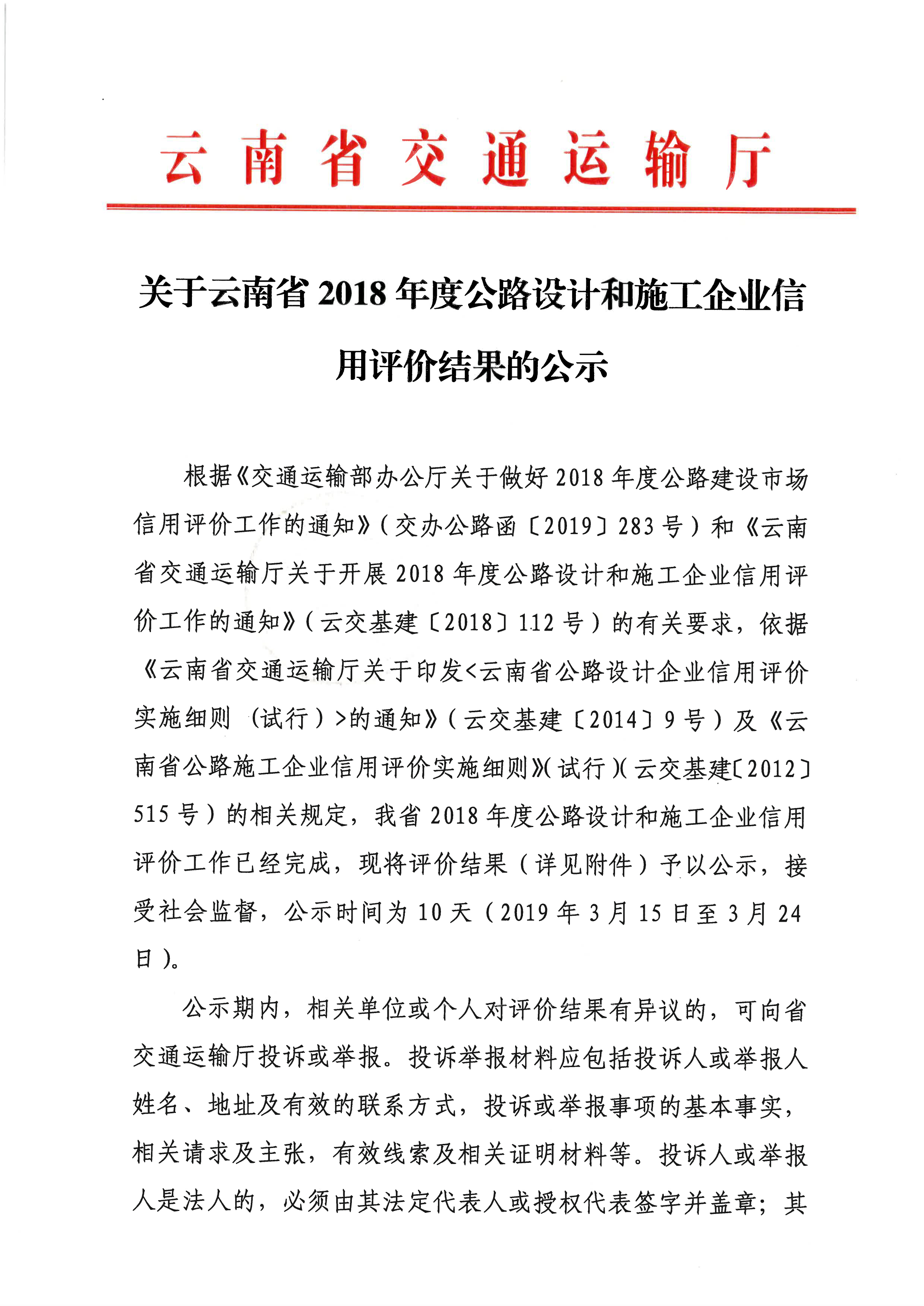 云南省2018年度公路設計和施工企業(yè)信用評價結(jié)果的公示