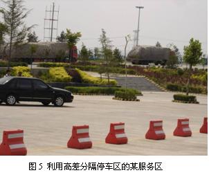 規(guī)劃應(yīng)考慮按照不同車(chē)輛的停車(chē)要求將停車(chē)場(chǎng)進(jìn)行合理劃分,較合理的劃分應(yīng)該是:客車(chē)區(qū)、小轎車(chē)區(qū)、貨車(chē)及超長(zhǎng)車(chē)區(qū)及特種車(chē)區(qū)。根據(jù)這四類(lèi)不同車(chē)輛的不同要求,規(guī)劃停車(chē)區(qū)和牽出道,嚴(yán)禁客貨混停,防止超長(zhǎng)車(chē)倒車(chē)停放。各區(qū)之間用綠島隔離,達(dá)到美化遮陽(yáng)的效果;或者利用地形高差自然分隔,也可以防止不同類(lèi)型車(chē)輛混停,這在我們調(diào)研中就有很好的一例(如圖5所示)。停車(chē)場(chǎng)可盡量做大,隔離島要少而小,避免影響停車(chē)和交通,要盡可能留有發(fā)展余地,所需土地可一次征用,分期擴(kuò)建,初期可暫以綠地替代。