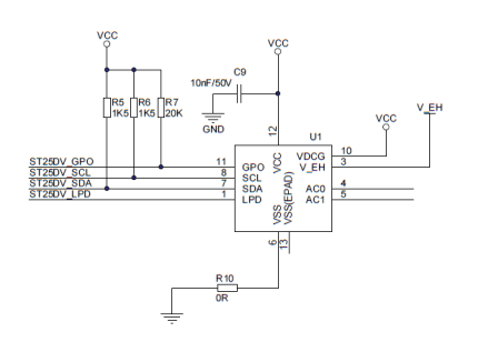 射頻閱讀器和識別器的核心在于RFID芯片。通常RFID芯片供電電壓1.8V-5.5V,帶有4K、16K或64K的E2PROM,通過片內串行總線I2C或者射頻進行數據傳輸。圖2為RFID芯片ST25的識別器電路原理圖。射頻識別芯片通過SCL和SDA和主控制器芯片完成通訊。控制器再和上位機完成信息交換傳輸。