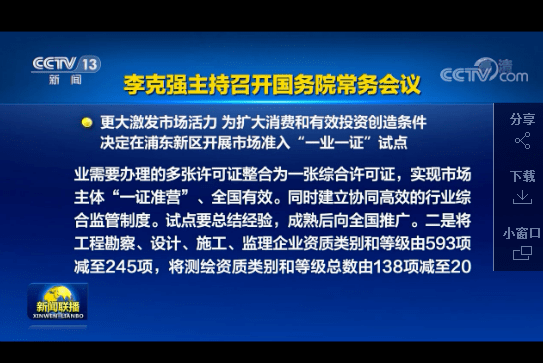 國務院總理李克強11月11日主持召開國務院常務會議,聽取國務院第七次大督查情況匯報,確保政策落實,更好發揮促進經濟穩定恢復的重要作用;決定在浦東新區開展市場準入“一業一證”試點,在全國大幅壓減建設工程企業和測繪資質并加強監管,更大激發市場活力,為擴大消費和有效投資創造條件。
