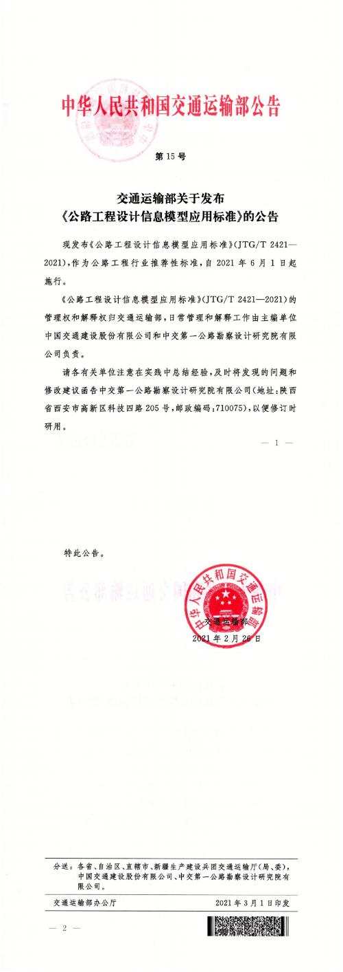 運輸部關(guān)于發(fā)布《公路工程設(shè)計信息模型應(yīng)用標準的公告》