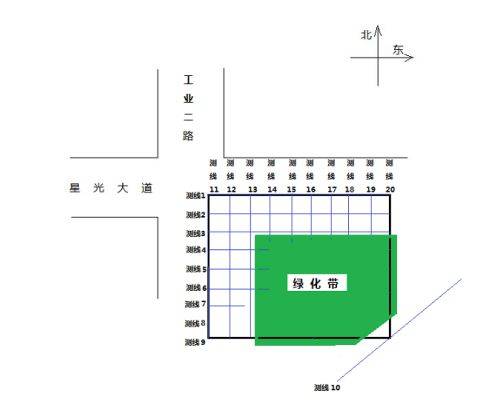 以工業(yè)二路與星光大道路口處左幅41#墩位為例,按業(yè)主要求及場地實(shí)際情況,本次勘察共布置測線20條,對被測區(qū)域進(jìn)行網(wǎng)格劃分,測區(qū)內(nèi)管線測線布置如下圖所示。(其它各墩位測線以此類推)