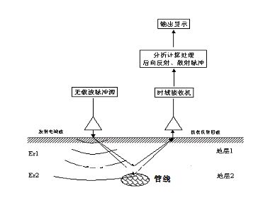 地質(zhì)雷達(dá)探測地下空洞是利用空洞與土層的電性差異來實(shí)現(xiàn)的。由于路面、土層、空洞、管線是不同的材料構(gòu)成,不同材質(zhì)間的接觸面及同一種材質(zhì)內(nèi)部不連續(xù)面都是良好的雷達(dá)波反射界面(即管線、空洞與土層接觸面、路面與土層的分界面等)。當(dāng)雷達(dá)波向下傳播經(jīng)過這些界面時,都會發(fā)生不同程度的反射、折射和散射,產(chǎn)生不同程度的波能吸收和衰減,集中反映在波形和波阻特征變化上。分析研究接收回波的特征差異,就可以揭示路面地下管線特征。