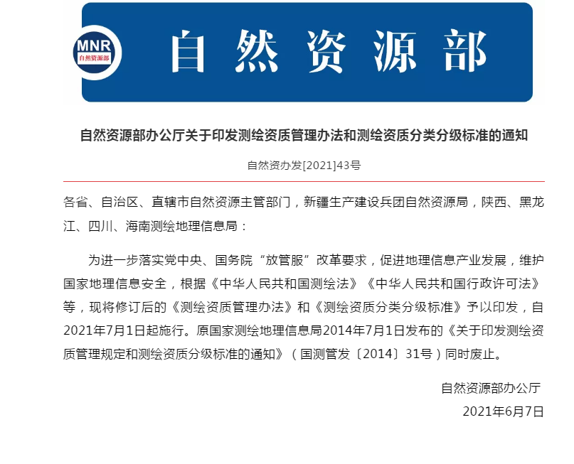 修訂版《測繪資質管理辦法》和《測繪資質分類分級標準》自2021年7月1日起施行