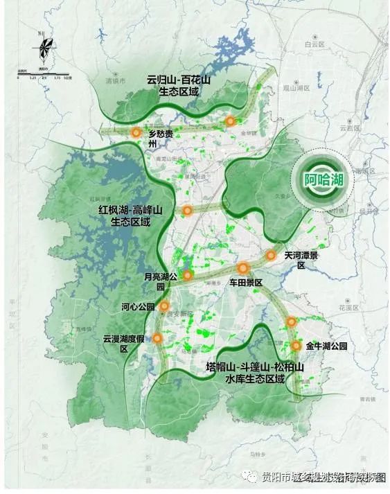 四片:紅楓湖-高峰山生態(tài)區(qū)域、云歸山-百花山生態(tài)區(qū)域、阿哈湖生態(tài)區(qū)域、塔帽山-斗篷山-松柏山水庫(kù)生態(tài)區(qū)域,強(qiáng)化區(qū)域生態(tài)保育功能,發(fā)揮區(qū)域生態(tài)基底作用。