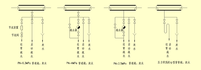 經常疏水:經常處于熱備用狀態的設備進汽管段的低位點,蒸汽不經常流通的管道死端,且是管道的低位點,飽和蒸汽管道和蒸汽伴熱管道的適當地點。