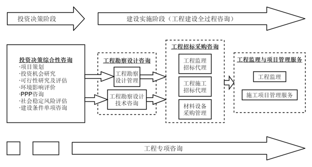 全過程工程咨詢(Construction Project Management,CPM)是指在土地收儲和規劃、項目可行性研究和設計階段,以及后續的投資決策、招投標、施工、竣工驗收、移交使用等各個階段,對工程項目的整個生命周期提供一站式的服務與管理。全過程工程咨詢可以幫助業主優化投資、控制風險、提高效率,實現工程質量、安全、進度等方面的目標,同時也可以促進行業健康發展、提升工程建設行業的水平和能力。國家推行全過程工程咨詢的主要目的是為了提高建設項目的質量和效益,降低工程風險和投資風險。通過引入專業的第三方咨詢機構,從項目立項、規劃設計、招投標、施工監理、驗收等各個環節對建設項目進行全過程跟蹤和管理,以保證工程質量和安全,并在控制投資成本和推進工期方面發揮積極作用。此外,全過程工程咨詢還有助于促進行業標準化、規范化和信息共享,提升整個建筑工程領域的發展水平和國際競爭力。
