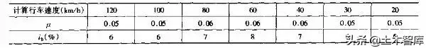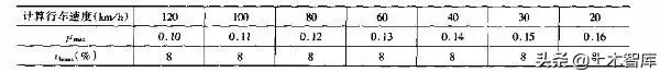 一般最小圓曲線半徑橫向力系數(shù)及超高橫坡度取用表