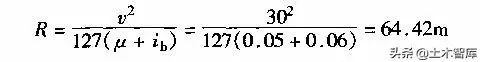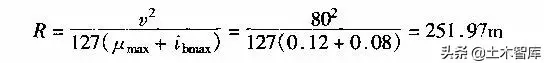 例1-2-1 某平原區(qū)二級公路,計算行車速度v=80km/h,試問該公路的極限最小半徑為多少?