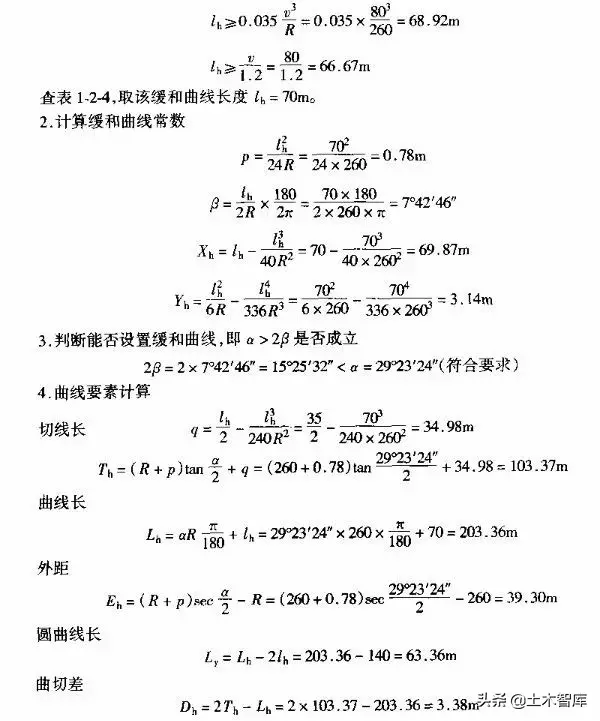 例1-2-4 某平原微丘區(qū)二級公路有一彎道,其平曲線半徑及R=260m,交點(diǎn)JD校號