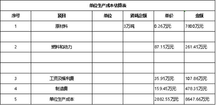 1)單位生產成本的估算,序號項目規格單位消耗定額單位金額