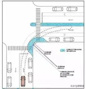 對(duì)小轉(zhuǎn)彎半徑的優(yōu)勢(shì)也有明確的研究和定性:越小的轉(zhuǎn)彎半徑,對(duì)過(guò)街行人越有利。小轉(zhuǎn)彎半徑優(yōu)勢(shì)明顯:①可以迫使機(jī)動(dòng)車(chē)轉(zhuǎn)彎時(shí)降低車(chē)速減少事故;②有效縮小交叉口范圍,減小行人過(guò)街的距離;③增大步道在交叉口轉(zhuǎn)角空間的面積;④有利于交叉口處步道坡道的設(shè)置。