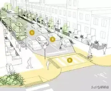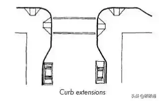 此外,在居住區(qū)或是有路側(cè)停車(chē)的城市支路,可將交叉口進(jìn)行縮窄設(shè)計(jì),以減小行人過(guò)街距離,進(jìn)一步降低車(chē)輛轉(zhuǎn)彎速度、保障行人安全。