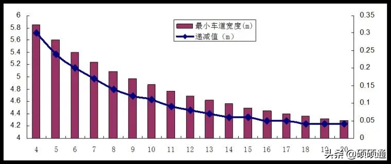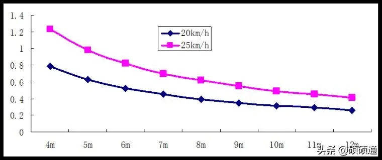 車(chē)輛轉(zhuǎn)彎有輪差,所以轉(zhuǎn)彎車(chē)道寬度要求一般稍大。以常規(guī)大巴公交車(chē)行駛為例,橫向側(cè)距取0.5米,則可以計(jì)算得出車(chē)道寬度和轉(zhuǎn)彎半徑的對(duì)應(yīng)關(guān)系圖如下。