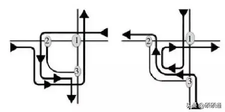 扇形交叉口左轉(zhuǎn)車(chē)輛的交通組織如圖所示: