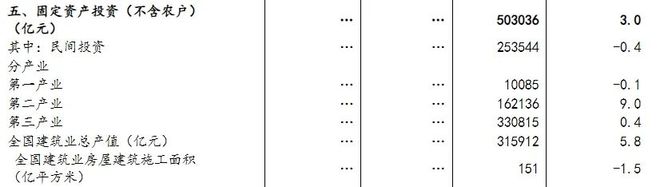 分產業看,第一產業投資10085億元,比上年下降0.1%;第二產業投資162136億元,增長9.0%;第三產業投資330815億元,增長0.4%。