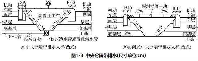 中央分隔帶的排水設施由排水溝(明溝、暗溝)、滲溝、雨水井、集水井、橫向排水管等組成。中央分隔帶可采用凸式(見圖1-8)、平式或凹式,一般不封閉,但也可封閉。