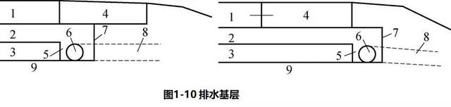 3)排水墊層。為攔截地下水、滯水或泉水進入路面結構,或排出因負溫差作用而積聚在路基上層的自由水, 可直接在路基頂面設置透水性排水墊層,并適當配置縱向集水溝、排水管或出水管等,如圖1-11所示。