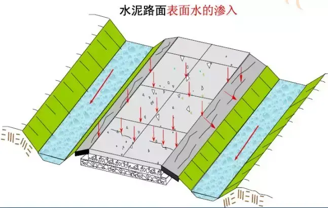 路面結構內部水的危害:浸濕各結構層材料和路基土,易造成無粘結粒狀材料和地基土的強度降低;使水泥混凝土路面產生唧泥,隨之出現錯臺、開裂和整個路肩破壞;進入空隙的自由水在行車荷載的作用下,會形成高孔隙水壓力和高流速的水流,引起路面基層的細顆粒產生唧泥,結果失去支承;在冰凍深度大于路面厚度的地方,高地下水位會造成凍脹,并在凍融期間降低承載能力;水使凍脹土產生不均勻凍脹;與水經常接觸將使瀝青混合料剝落,影響瀝青混凝土耐久性和產生龜裂。