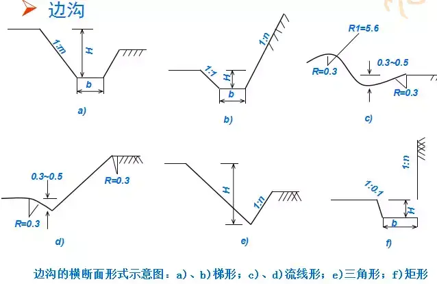 ①排水溝的橫斷面一般采用梯形,尺寸大小應經過水力水文計算選定;