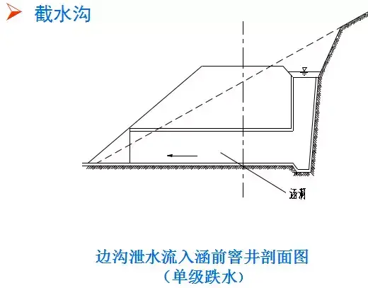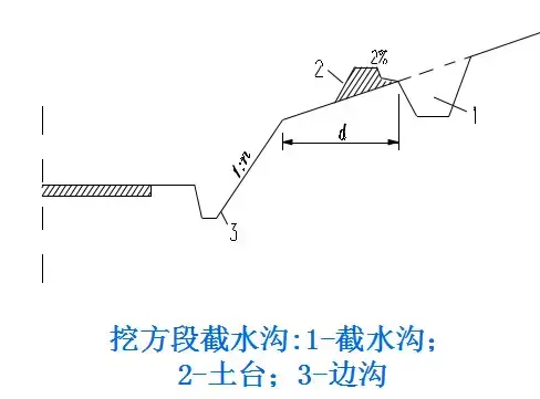 2.截水溝:又稱天溝,一般設置在挖方路基邊坡坡頂以外,或山坡路堤上方的適當地點,用以攔截并排除路基上方流向路基的地面徑流。