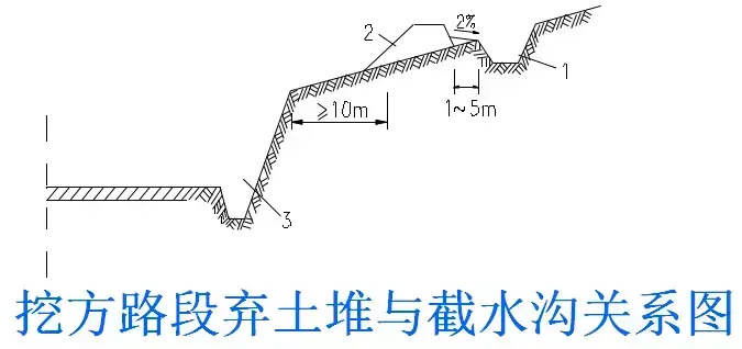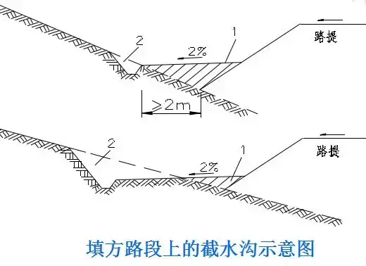 (1)橫向位置:截水溝一般布置在路塹邊坡或陡坡路堤上側,垂直于山坡水流方向或基本與等高線平行。視降雨量,可以不設或設計多道。
