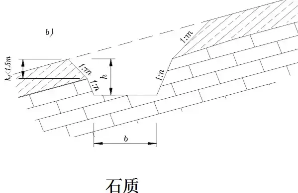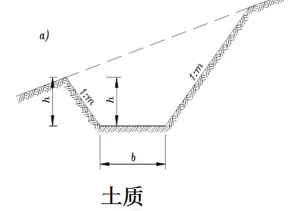 橫斷面:一般為梯形,溝的邊坡坡度,因巖土條件而定,一般采用1:1.0~1:1.5。溝底寬度b不小于0.5m,溝深h按設計流量而定,亦不應小于0.5m。