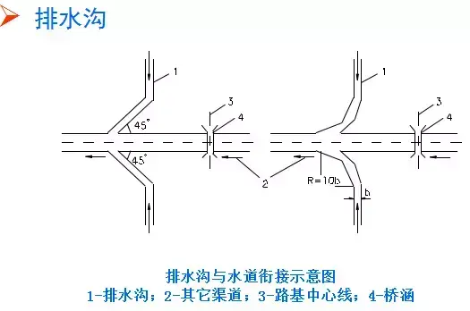(3)排水溝水流注入其他溝渠或水道時,應使原水道不產生沖刷或淤積。通常應使排水溝與原水道兩者成銳角相交,交角不大于45?,有條件可用半徑R=10b(b為溝頂寬)的圓曲線朝下游與其它水道相接。