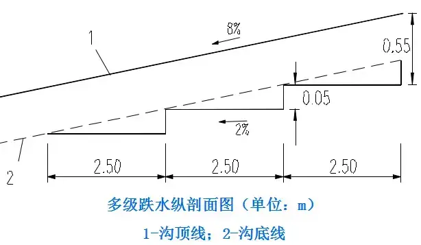 4.跌水與急流槽:跌水與急流槽是路基地面排水溝渠的特殊形, 用于陡坡地段,溝底縱坡可達45度。在陡坡或深溝地段設置的溝底為階梯,水流呈瀑布式跌落的溝槽稱作跌水。跌水的作用是在較短的距離內,降低水流流速,消減水流能量,進而防止沖刷(用于坡度大于10%,水頭高差大于1.0m的陡坡地段)