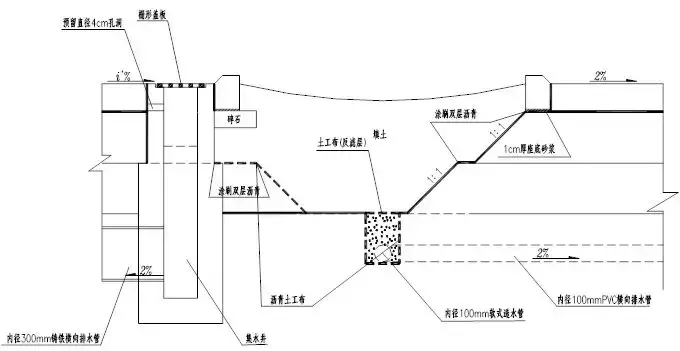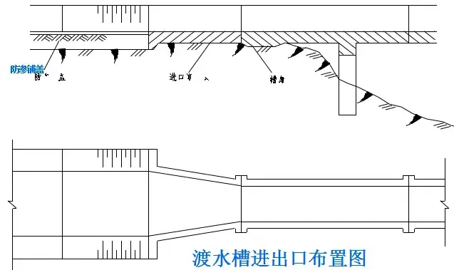 (1)設置要點:不宜過長,溝底應具有1%~2%的縱坡,出水口底面標高應高出溝外最高水位20cm,以防水力倒滲。
