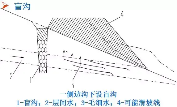 7.盲溝:相對于地面排水的明溝而言,盲溝又稱為暗溝,是一種隱蔽工程。在溝內填以大小不同的顆粒材料,利用滲水材料的透水性將地下水匯集與溝內,并沿溝排泄至指定地點。