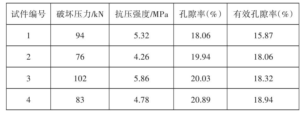 同時,水灰比W/C指標需要按照集料級配設計結果具體確定,并基于工程實際情況通過室內試驗進行優(yōu)化。本項目集料選用花崗巖,采用室內試驗進行分析,以水灰比W/C=0.4的標準制作4組試件,并分別開展試驗,所得結果如表2所示。
