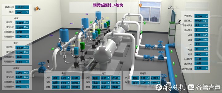 而在濟南水務集團二級供水監(jiān)控中心內(nèi),大屏上正實時顯示每個二次泵站小區(qū)設(shè)備運行情況,值班人員時刻通過平臺查看設(shè)備電壓、用電量、進出廠壓力、水箱液位是否處于良好狀態(tài)。而這僅是智慧水務信息收集與檢測的一個縮影。