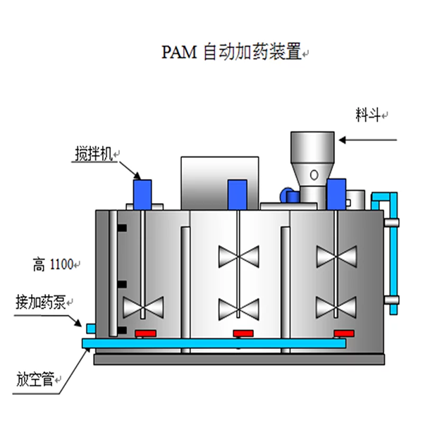裝置工作原理:干粉絮凝劑加入干粉料斗后,按設定的配比濃度,由螺桿給料機定量輸入溶解箱內,與定量的清水混合,經過攪拌器攪拌、熟化后,由計量泵將混合液外輸至加藥點 。